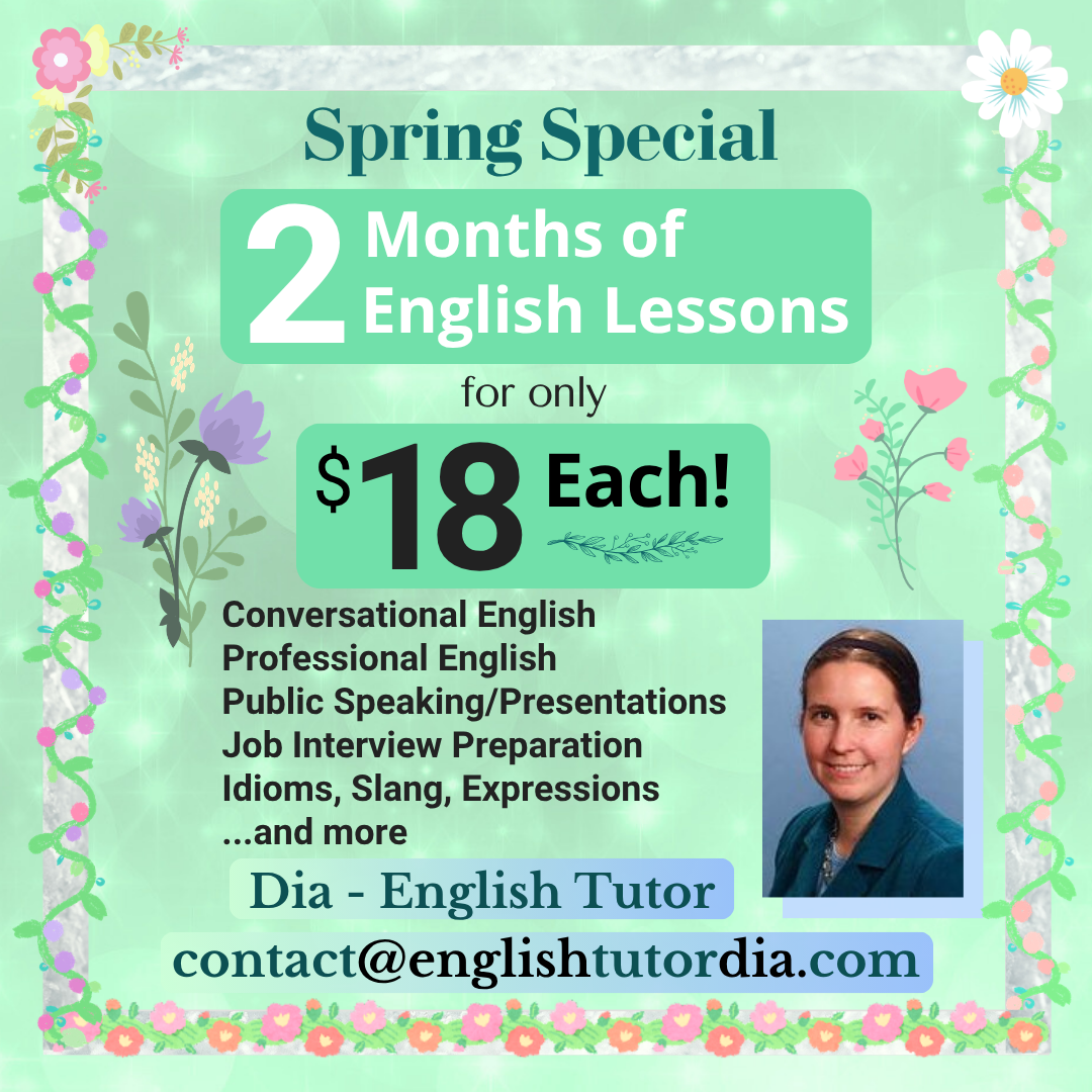 Improve your English skills with high quality tutoring! Learn more about my Spring Special, additional discounts, editing rates, and more here.